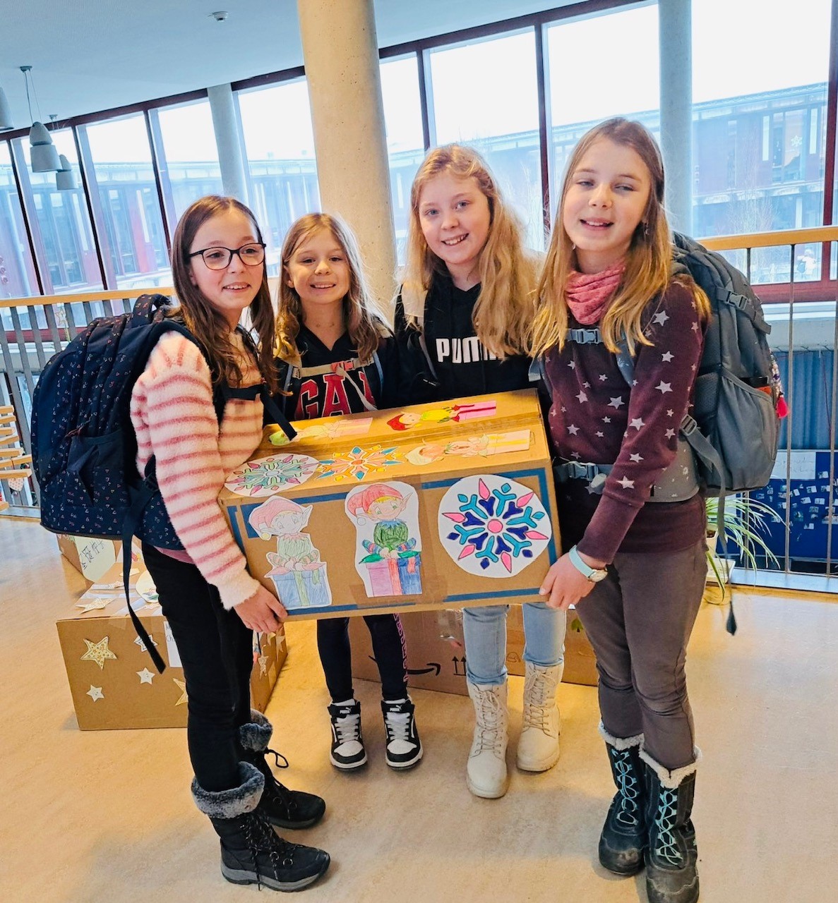 Mit großem Engagement stellten die Klassen Päckchen mit haltbaren Lebensmitteln sowie Hygieneartikeln zusammen. Die Pakete wurden sorgfältig gepackt und sollen Menschen in Not ein wenig Unterstützung und Hoffnung zur Weihnachtszeit schenken. Insgesamt konnten 25 Weihnachtspakete gesammelt werden. Am 19.12.2025 wurden diese offiziell an die Johanniter übergeben, die den Weitertransport und die Verteilung der Pakete nach Osteuropa übernehmen und Familien dort ein kleines Lächeln zur Weihnachtszeit schenken.