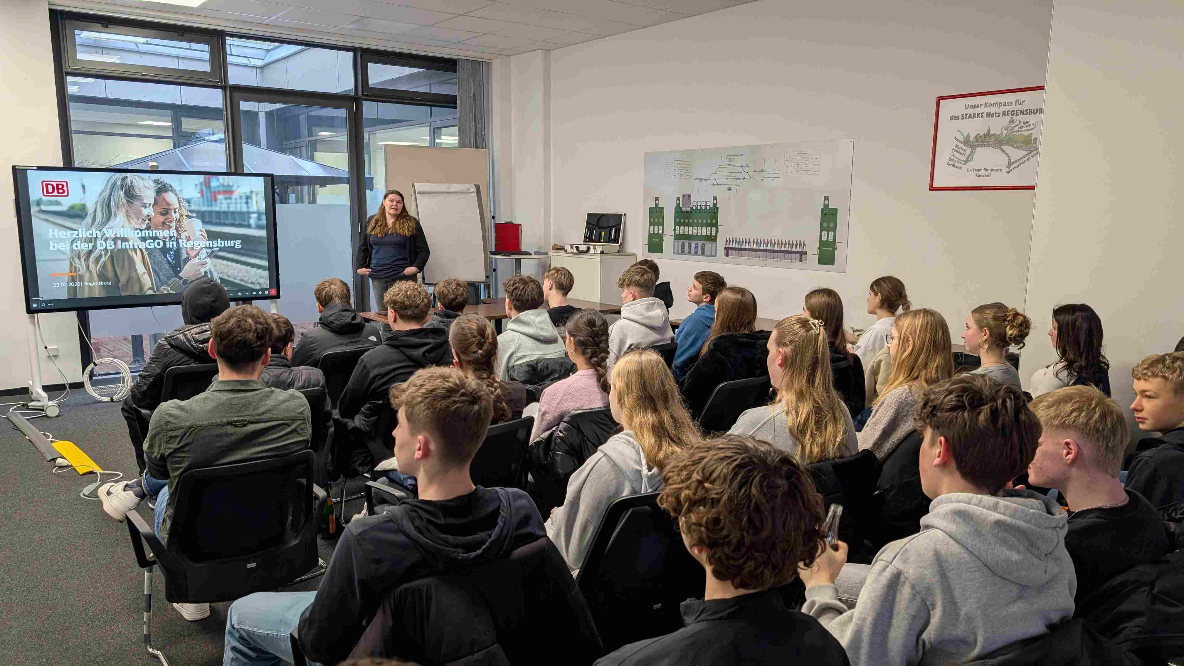 Der Tag begann mit einem informativen Vortrag, in dem wir einen umfassenden Überblick über die vielfältigen Ausbildungsmöglichkeiten bei der DB erhielten. Dabei wurden nicht nur klassische Berufe wie Fahrdienstleiter, Elektroniker für Betriebstechnik und Gleisbauer vorgestellt, sondern auch die Rahmenbedingungen, verschiedene Einstiegswege und attraktive Benefits einer Ausbildung erläutert.